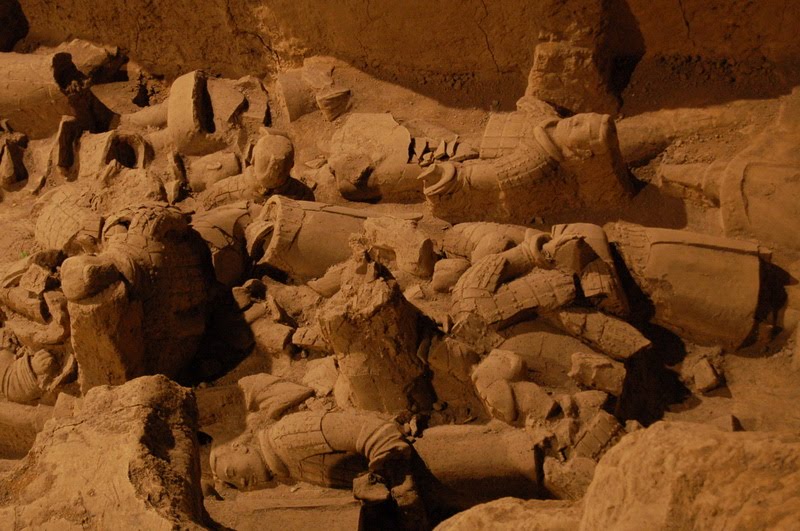 Ens tornem a presentar al cap d’uns minuts amb les entrades i accedim al primer recinte, que guarda algunes figures, les més ben conservades, i altres elements d’aquella època en vitrines. Hi ha totes les explicacions necessàries per ben situar-te a finals del segle III aC, en plena dinastia Qin. I s’hi està fresquet. No obstant, no és massa espectacular i està ple de xinesos donant empentes intentant estar a primera línia. Passem al segon recinte.